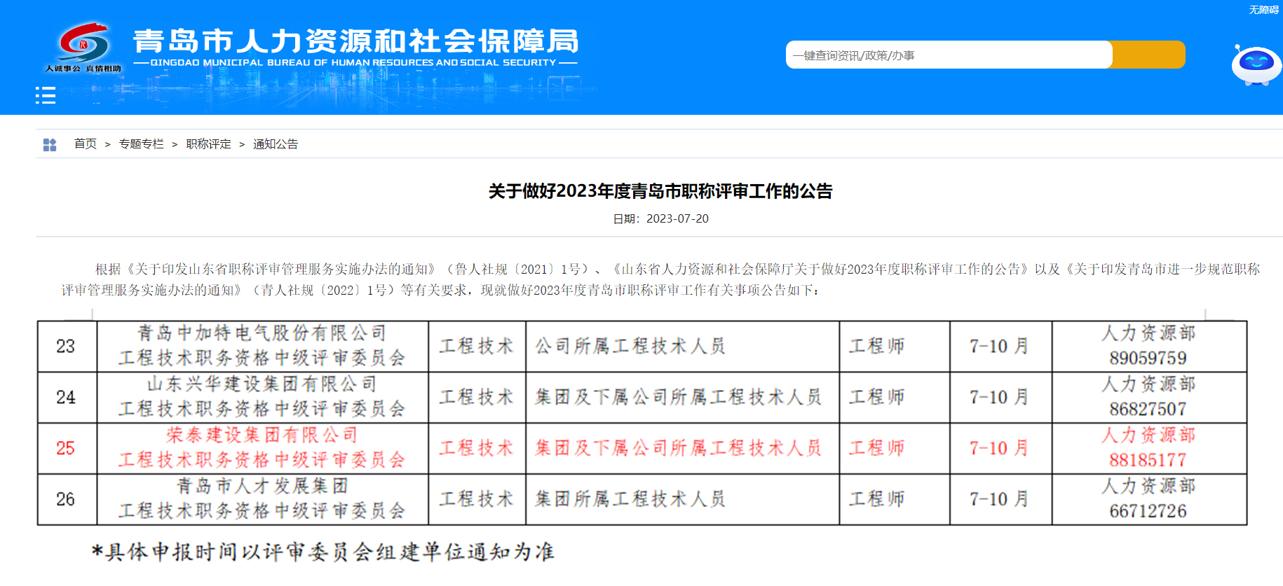 為穩(wěn)步推進(jìn)職稱制度改革,根據(jù)青島市人力資源和社會(huì)保障局《關(guān)于做好2023年度青島市職稱評審工作的公告》,集團(tuán)于8月獲得青島市工程技術(shù)類初級、中級職稱自主評審資格,負(fù)責(zé)評審集團(tuán)范圍內(nèi)青島地區(qū)所屬工程技術(shù)人員職稱評審。