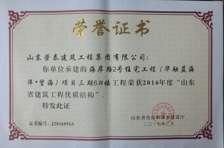 榮泰集團(tuán)工程獲“山東省建筑工程優(yōu)質(zhì)結(jié)構(gòu)”榮譽(yù)稱號(hào)